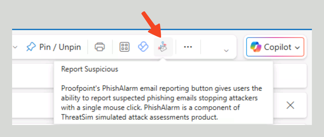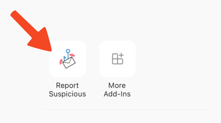 Click the **Report Suspicious** button in Outlook. If you don’t see the button, please double‑click the email to open it, and then you should see it.